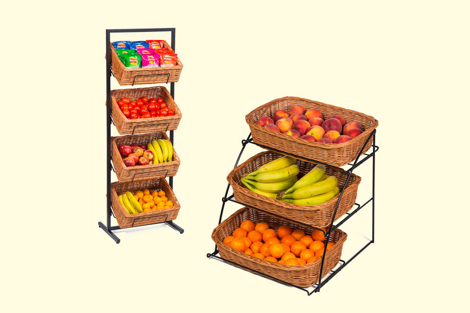 Our retail and catering basket collections include a wide range of display trays, baskets, and floors stand ideal for displaying goods in store windows on interior displays.